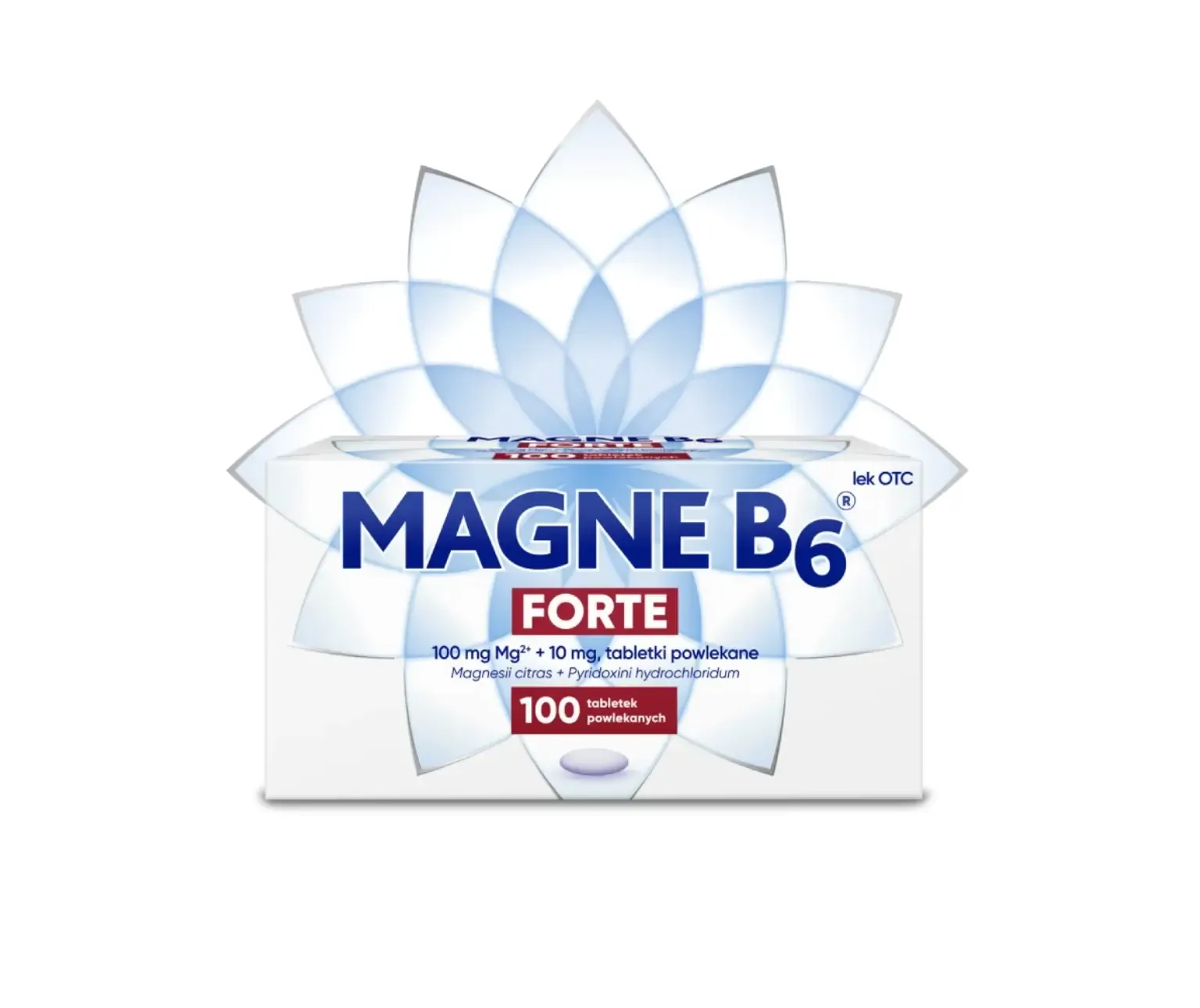 Magne B6 Forte, tabletki powlekane, 100 mg jonów magnezu w postaci cytrynianu magnezu i 10 mg witaminy B6. Wskazania: niedobór magnezu. Występowanie tych objawów może wskazywać na niedobór magnezu: nerwowość, drażliwość, wahania nastroju, łagodny lęk, niepokój, przejściowe uczucie zmęczenia, ospałość, zaburzenia snu w niewielkim nasileniu; objawy lęku, takie jak kurcze przewodu pokarmowego lub kołatanie serca (bez zaburzeń serca); kurcze mięśni, mrowienie, drganie powiek. Uzupełnienie magnezu może złagodzić te objawy. W przypadku braku poprawy po miesiącu stosowania leku, kontynuowanie leczenia nie jest zalecane.