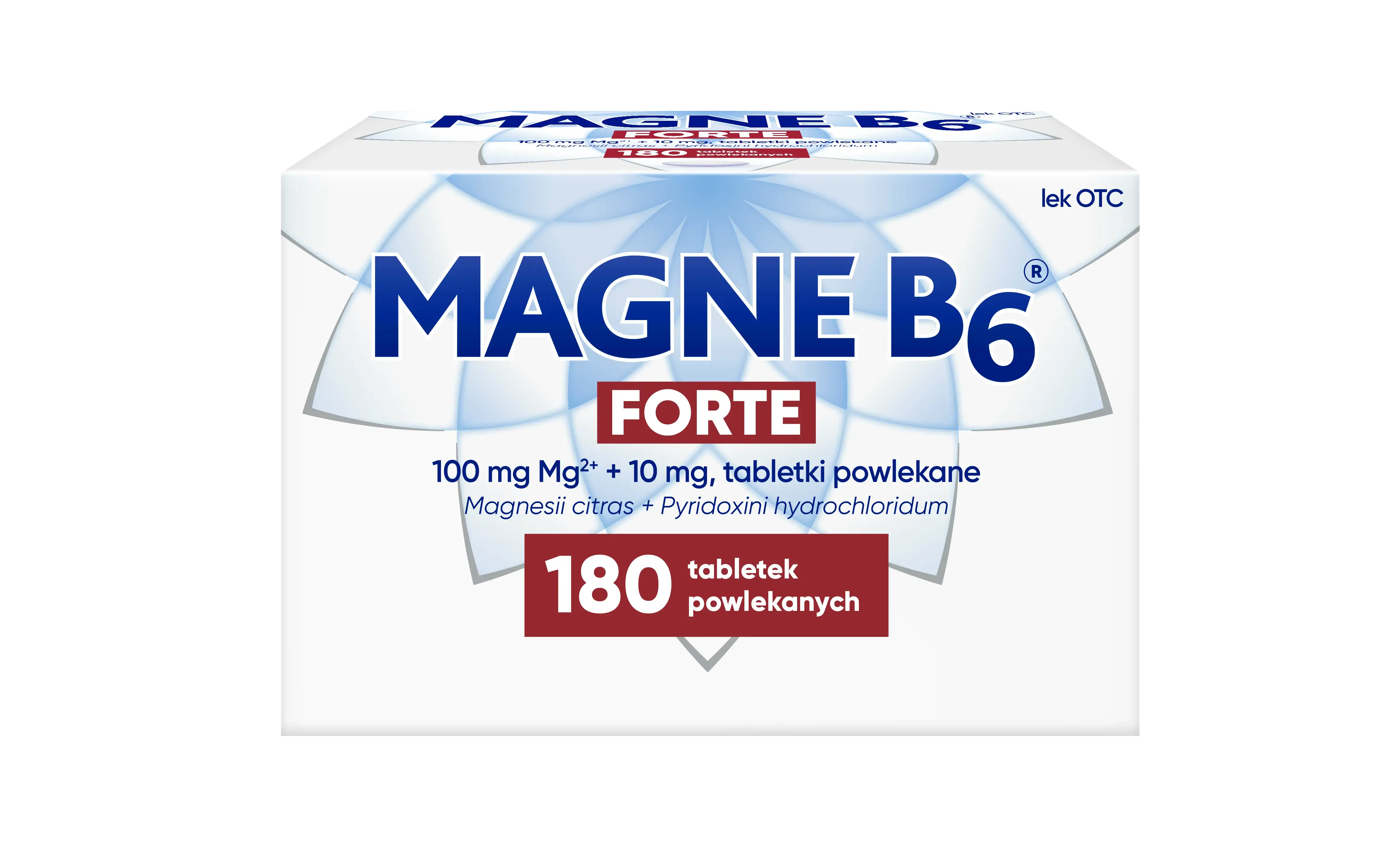 Magne B6 Forte, tabletki powlekane, 100 mg jonów magnezu w postaci cytrynianu magnezu i 10 mg witaminy B6. Wskazania: niedobór magnezu. Występowanie tych objawów może wskazywać na niedobór magnezu: nerwowość, drażliwość, wahania nastroju, łagodny lęk, niepokój, przejściowe uczucie zmęczenia, ospałość, zaburzenia snu w niewielkim nasileniu; objawy lęku, takie jak kurcze przewodu pokarmowego lub kołatanie serca (bez zaburzeń serca); kurcze mięśni, mrowienie, drganie powiek. Uzupełnienie magnezu może złagodzić te objawy. W przypadku braku poprawy po miesiącu stosowania leku, kontynuowanie leczenia nie jest zalecane.