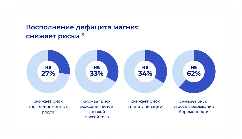 Практически 8 из 10 беременных пациенток имеют дефицит магния. Важно его вовремя диагностировать и начать восполнять. Магний играет важнейшую роль в формировании плаценты, профилактике невынашивания и снижении рисков развития пороков плода3.