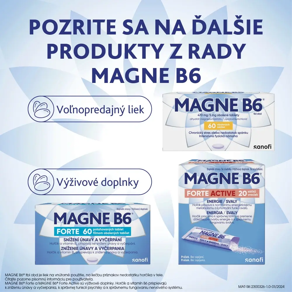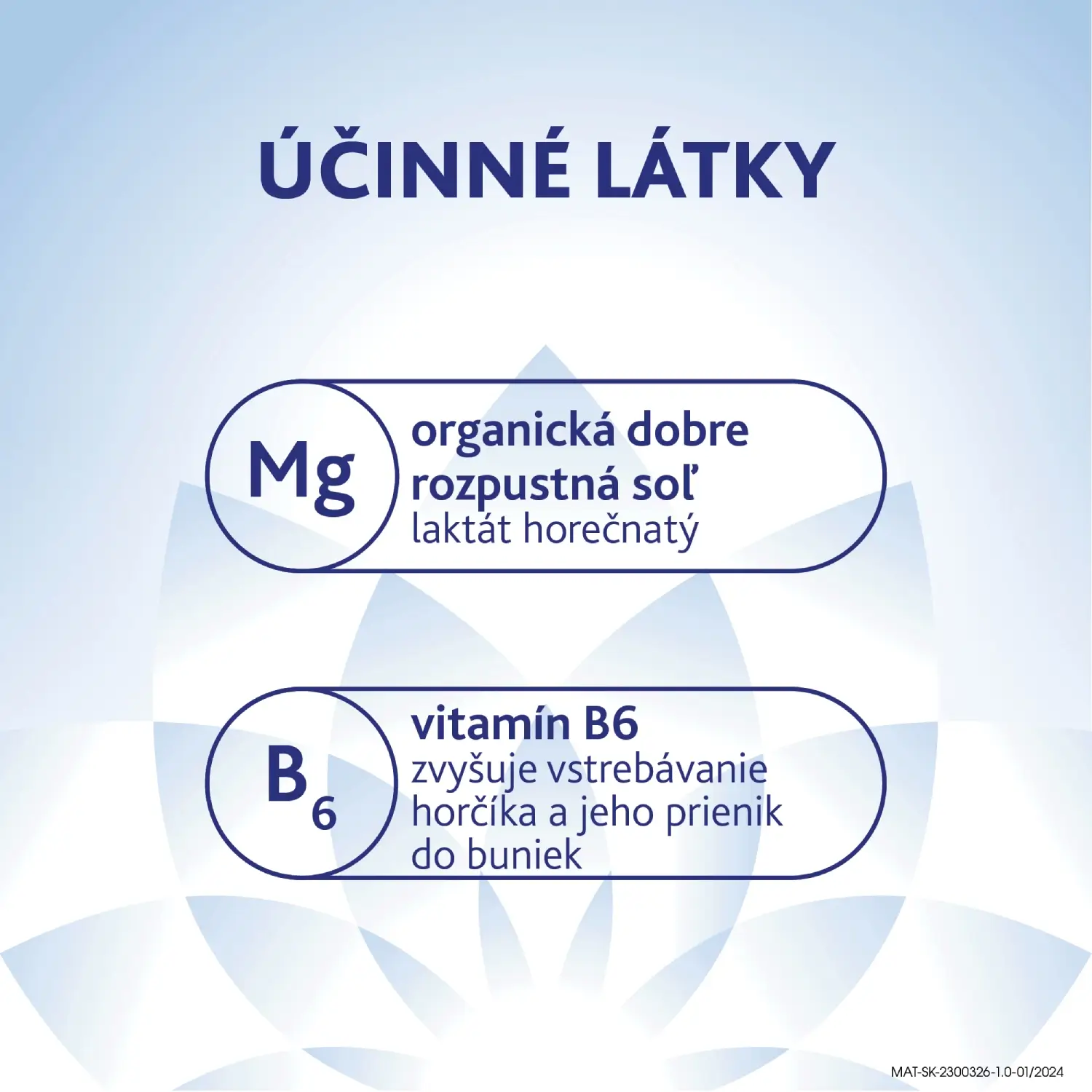 Liek MAGNE B6® tbl obd obsahuje horčík v kombinácii s vitamínom B6 a je určený na liečbu nedostatku horčíka, ku ktorému môže dôjsť pri rôznych situáciách ako napríklad po intenzívnej fyzickej námahe, pri chronickom strese alebo pri nedostatku spánku.